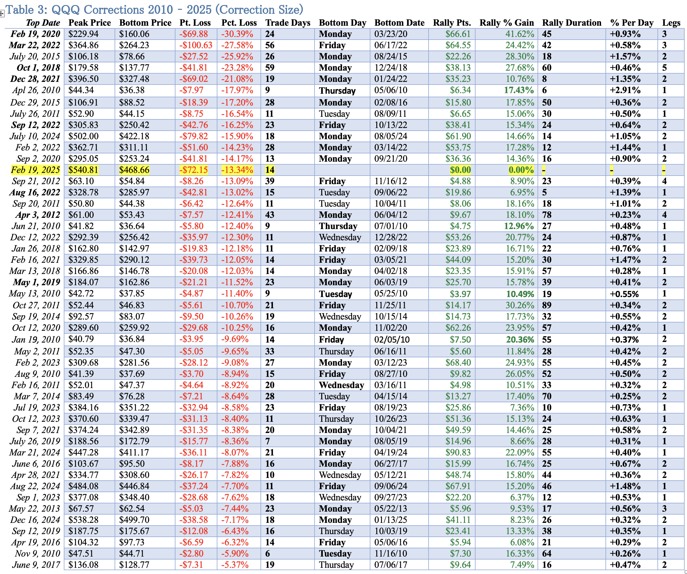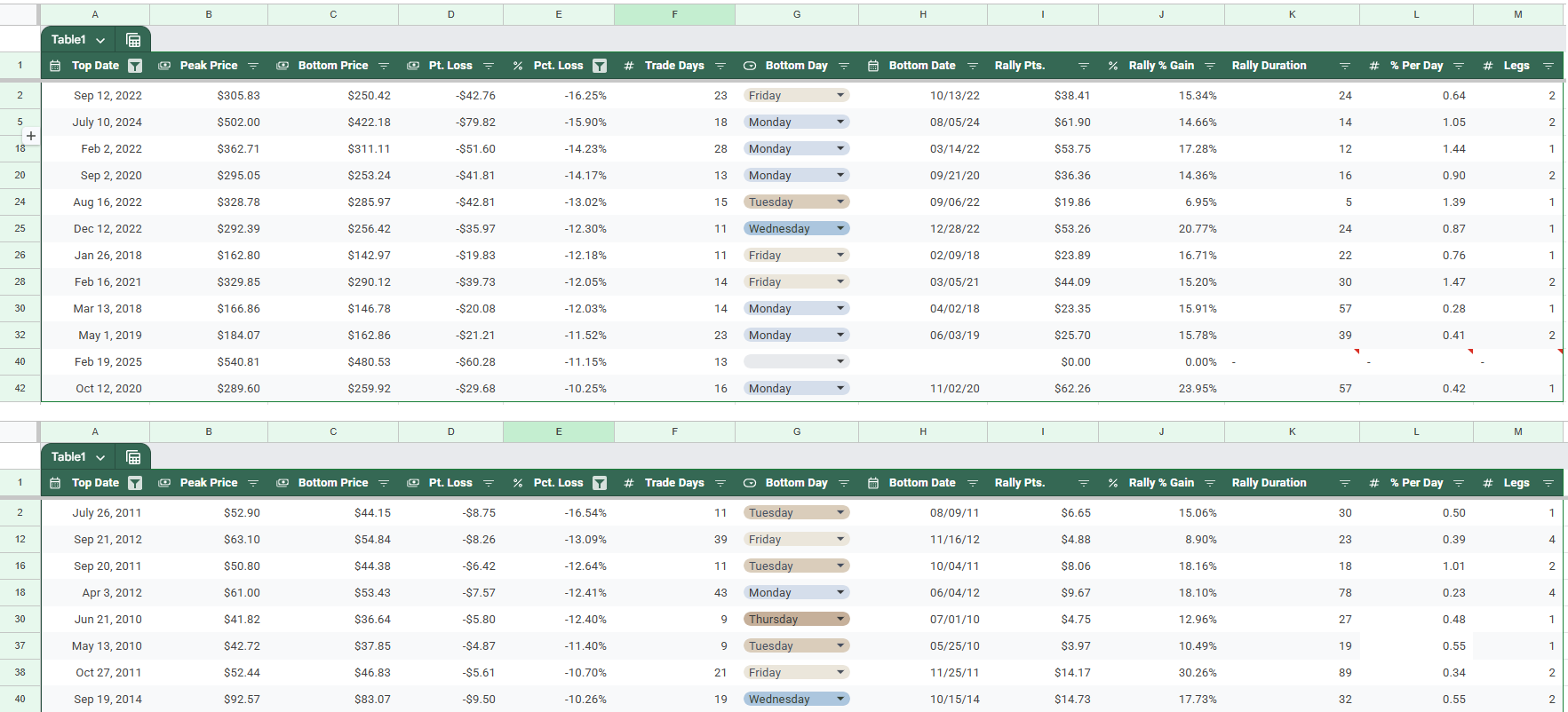 I filtered your table for data for the high octane era of between Jan 26, 2018 to Feb 19, 2025 with a ‘%Pct. Loss’ of -16.25% to -10.25%: