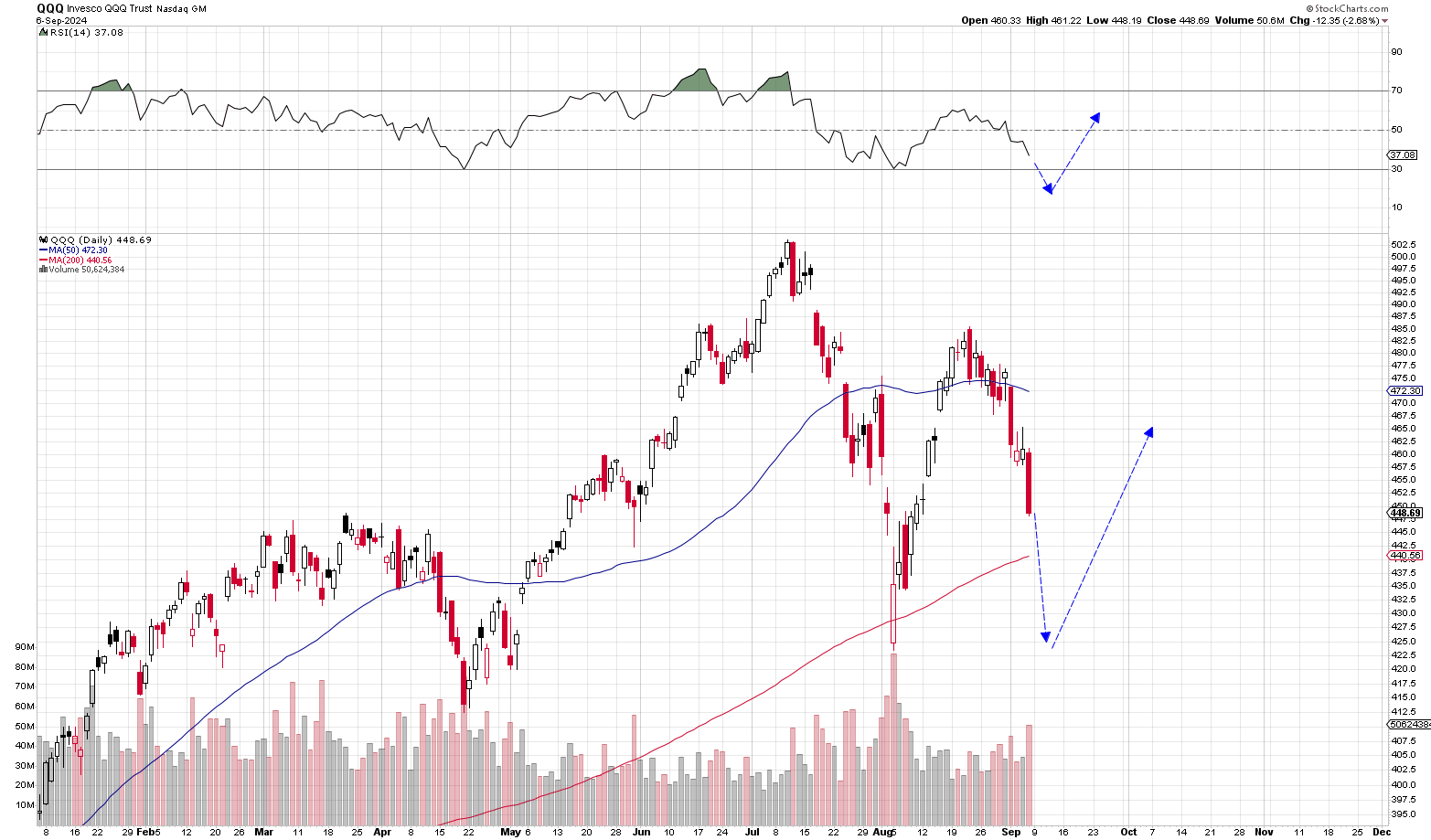 Now it’s important to point out that with the QQQ is just barely into the mid-20’s on the RSI and can go a little lower as we saw during the August 5 correction. We don’t often see the NASDAQ-100 get as oversold as it did near the end of July, but it does happen from time to time and it’s important to keep perspective here.
