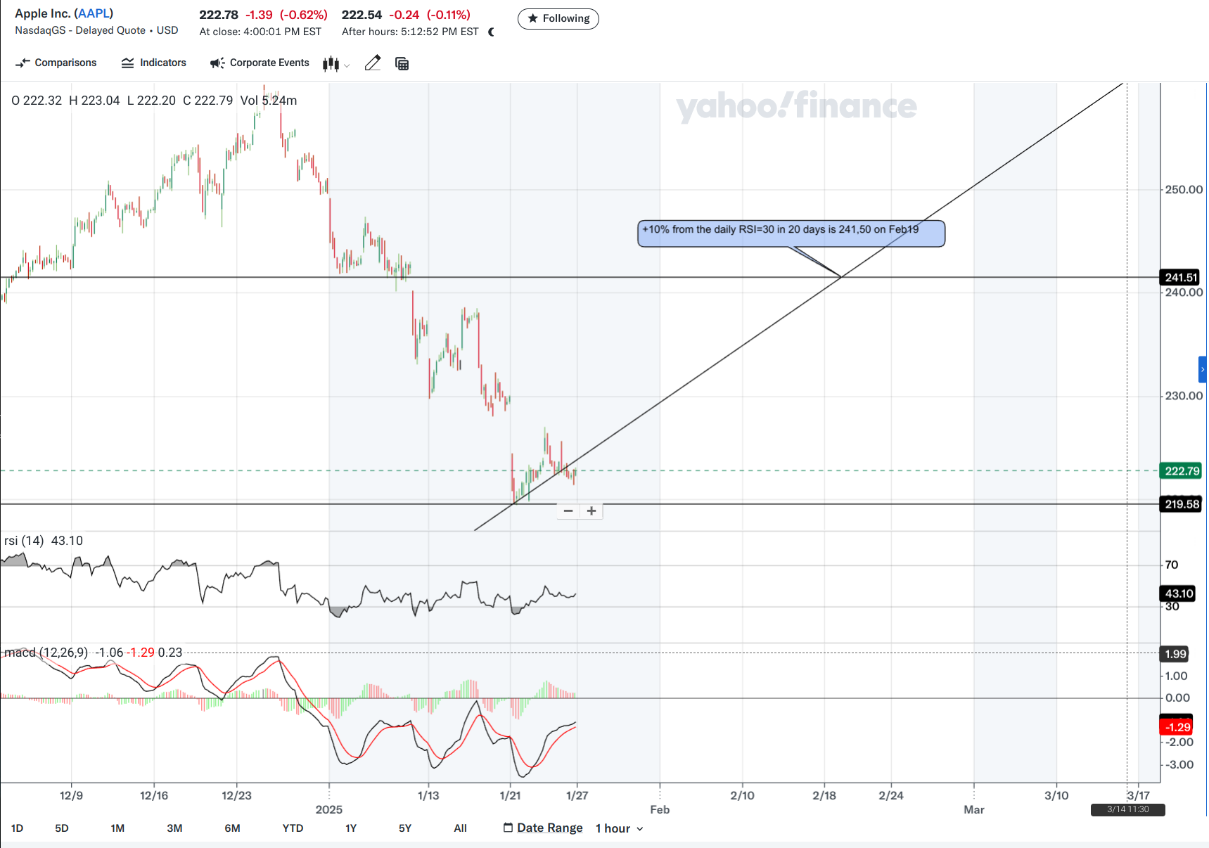 What are your thoughts on AAPL heading into earnings next week? Do you think there is a possibility of breaking down to $215? Seems to be holding $222 quite well
