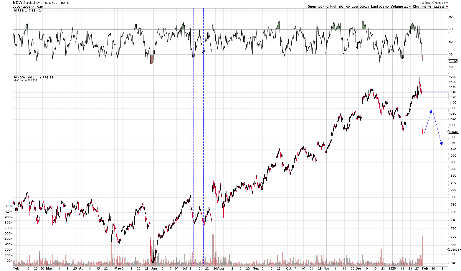 Sam, what do you think of NOW? It dropped about $120-140 after its earnings last night, and it’s oversold on the hourly chart. I was looking at 300%-400% spreads for $1100-1150~ for March or April