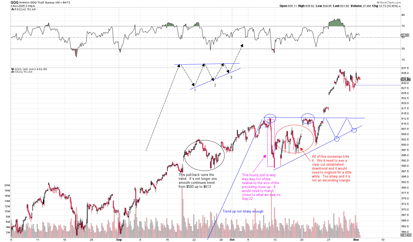 First, Acending triangles are very bullish formations and huge reversals run totally counter to that. That reversal we observed on October 10 relative to the size of the preceding trend and volatility profile on the QQQ is far far too sharp to establish a basis for an ascending triangle.