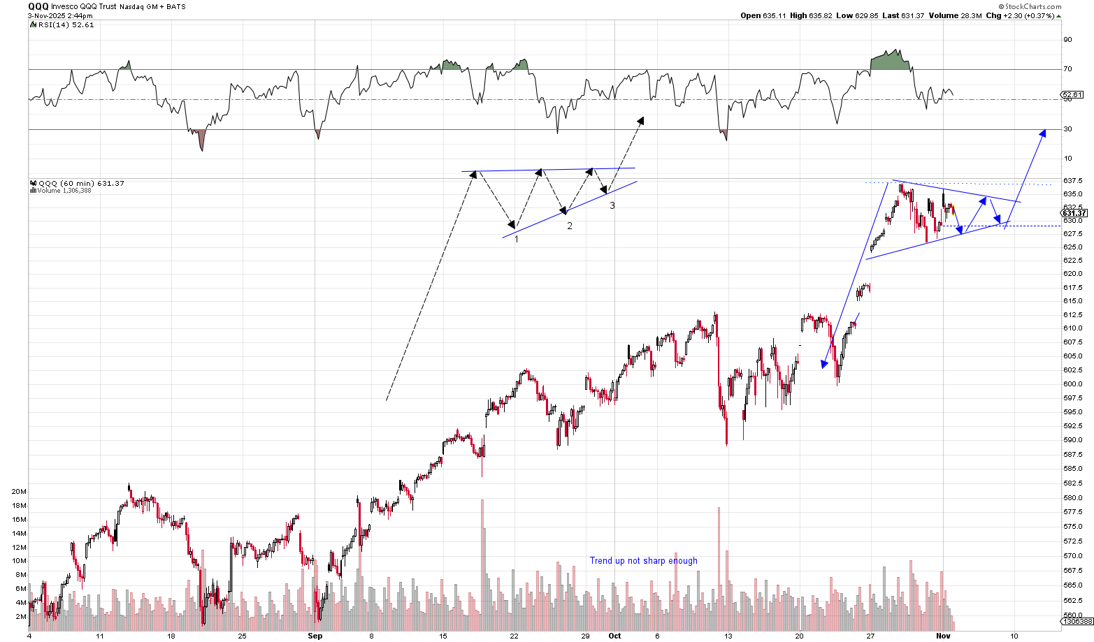 Now to answer your question, let’s consider it. Let’s suppose the QQQ forms a symmetrical triangle and breaks out. No big deal. It just means we go to $646 as expected. yOu can have a triangle breakout that leads to a top right at our point near $646. Notice that in a symmetrical triangle, the breakout point is likely to be somewhere near $633-634 a sahre. It break out 10-points and top.